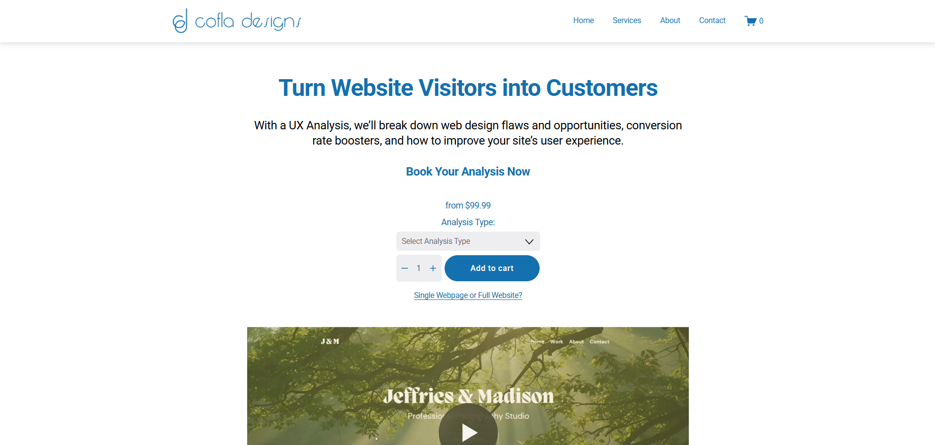 cofla designs is my UX and web design services company, focused on helping small business thrive online. With cofla designs being a newer company, I needed a website that served as a great first impression to new and returning clients, as well as something that served as a one-stop-shop for purchasing services.